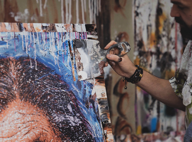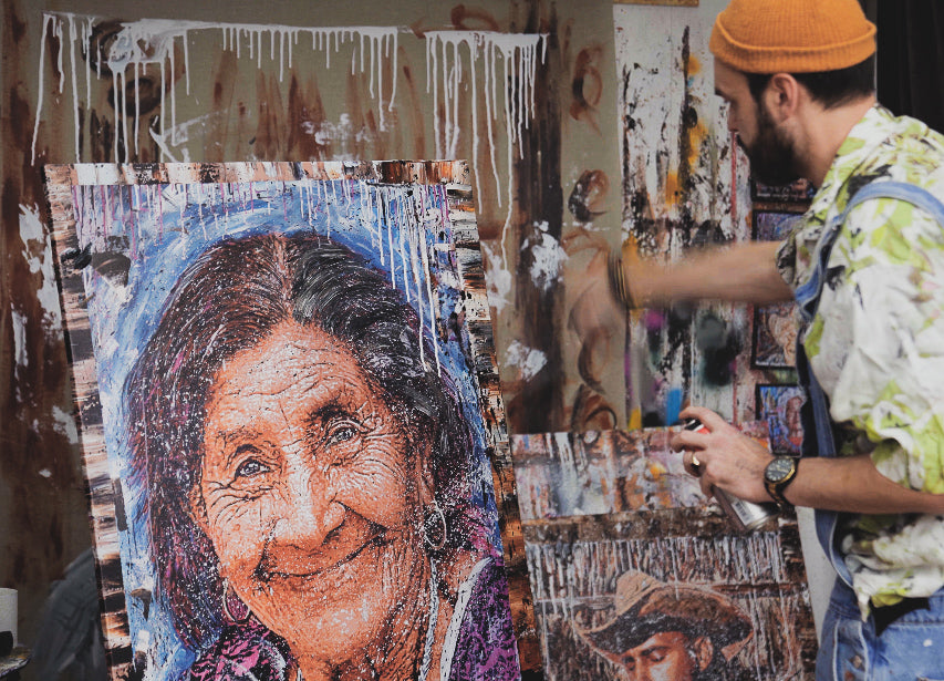 Tryk på bomuldslærred med nye unikke penselstrøg med akryl og spray